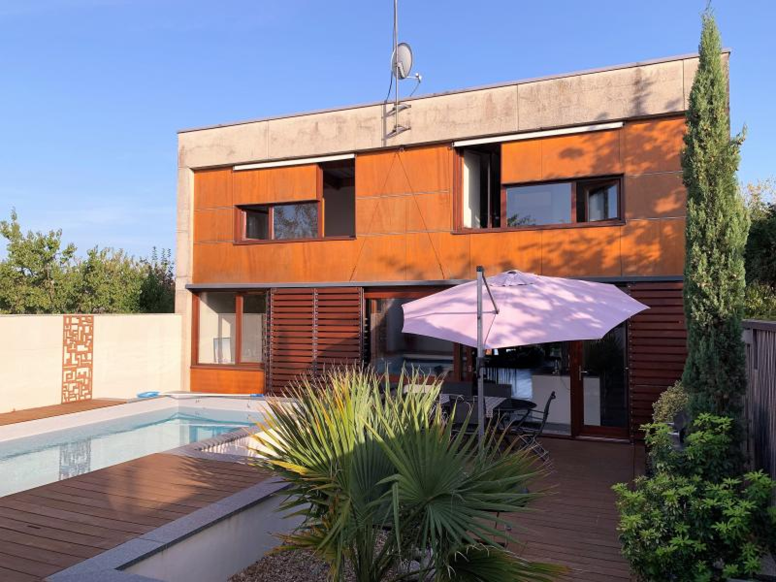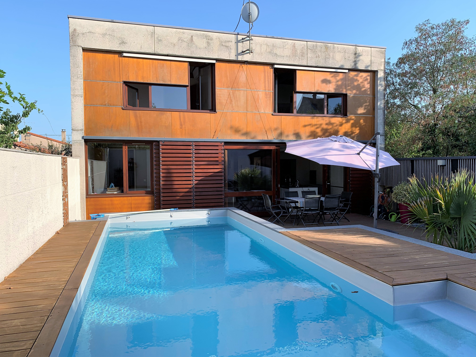 - Piscine chauffée à l'arrière de la maison avec volet roulant électrique
