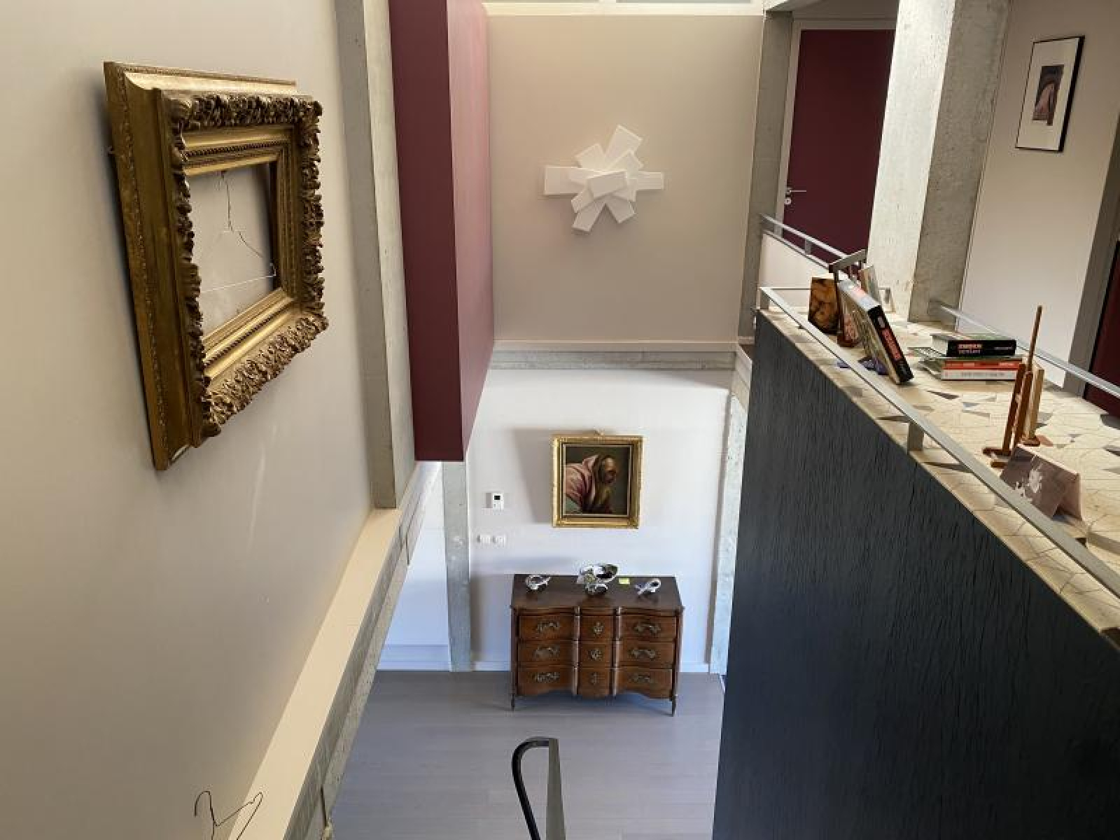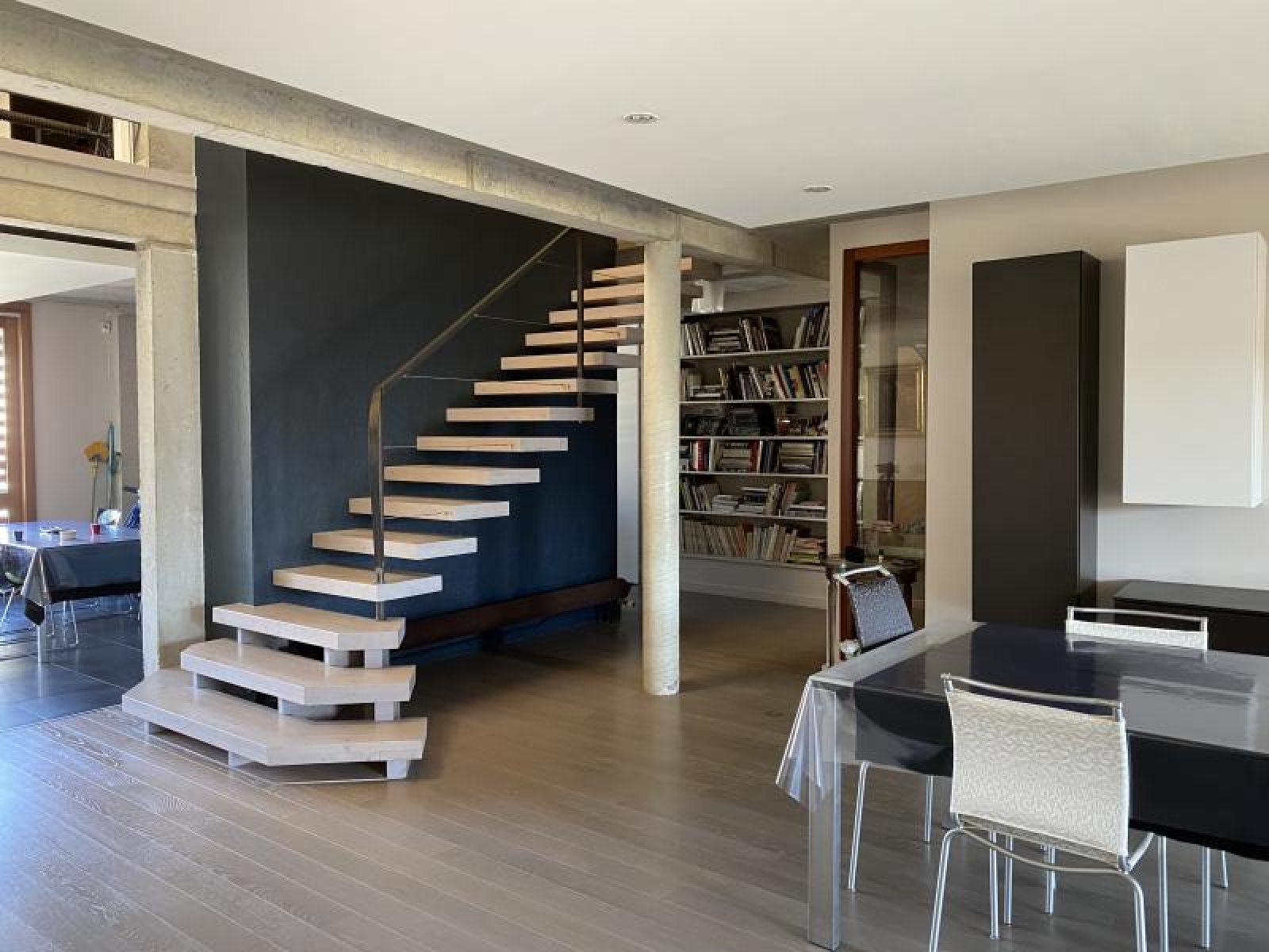 Les radiateurs à ailettes (en fonte) au sol dégagent les volumes des pièces. Les volets remplacés par des claustras accentuent le cachet de la maison. Les nombreux mobiliers intégrés, dessinés par l'architecte, ont été réalisés dans l'esprit de Charlotte Périand.