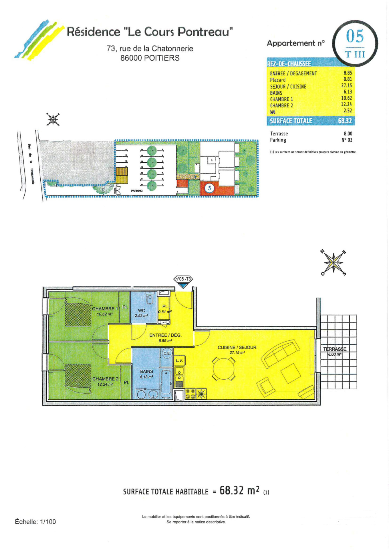 T3 70 m² RDC avec jardin + terrasse + parking – Résidence récente – Poitiers Pontreau